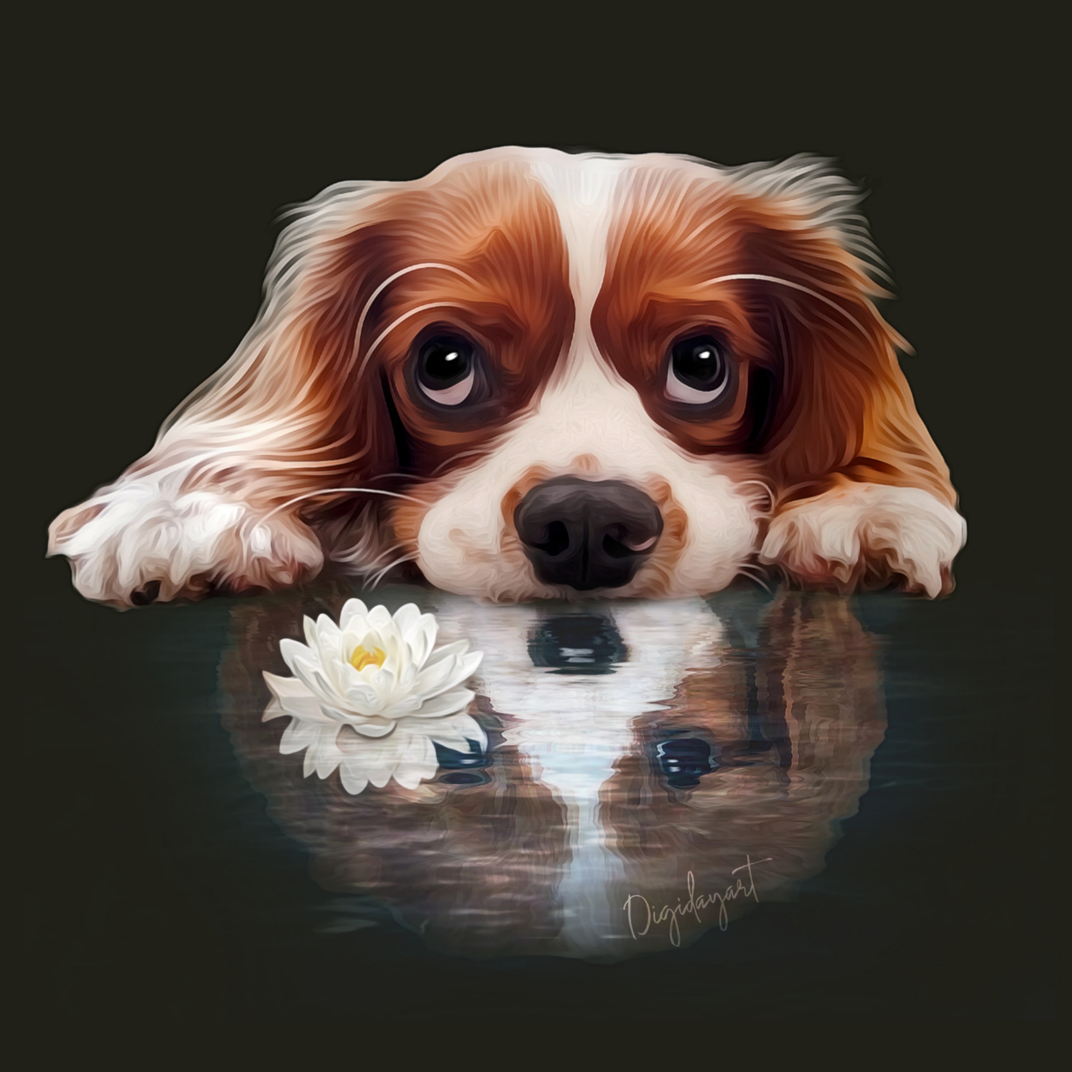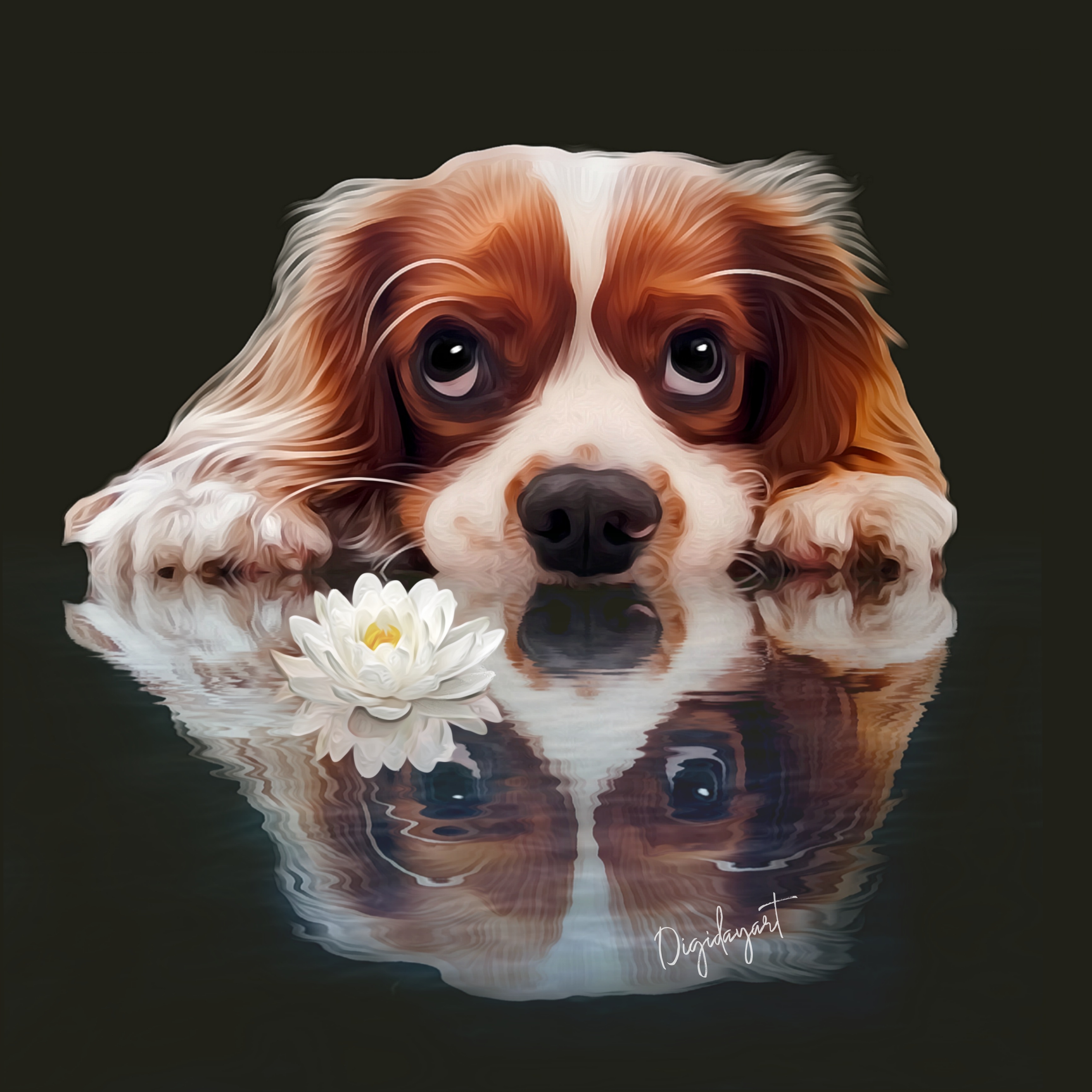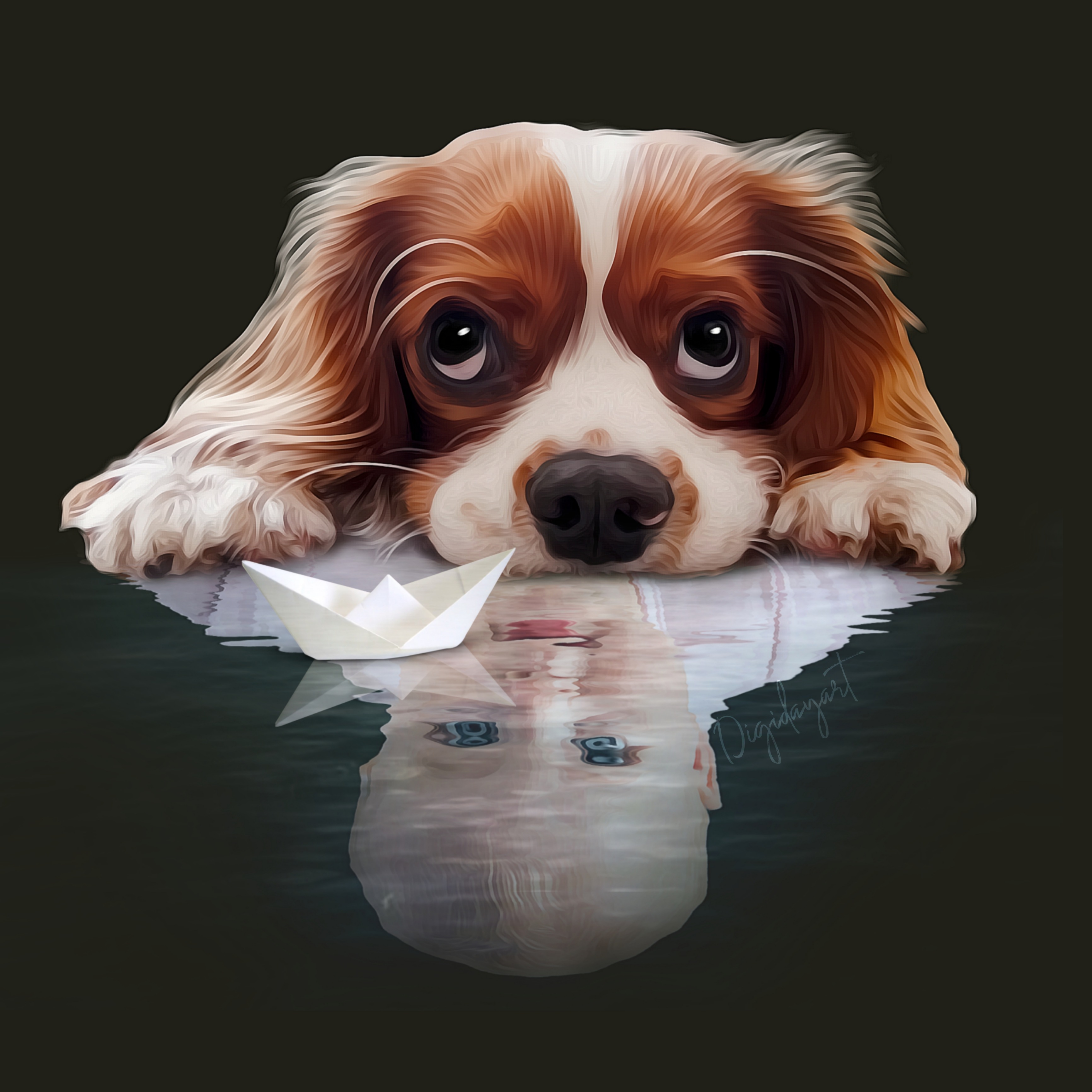 Het idee ontstond door de houding van dit hondje. Hij ligt plat op de grond met zijn kop. Als ik alleen zijn koppie zou gebruiken (wat ik normaal doe) dan is dat een vreemd gezicht op het portret. Ik bedacht om hem te spiegelen en een water effect te geven. Door de waterlelie erbij te doen geeft het nog meer het idee dat het water is. Dit kan ook een ander voorwerp zijn zoals bij afbeelding 3 een bootje. Maar zijn of haar favoriete speeltje kan natuurlijk ook heel leuk zijn en maakt het portret dan nog persoonlijker.