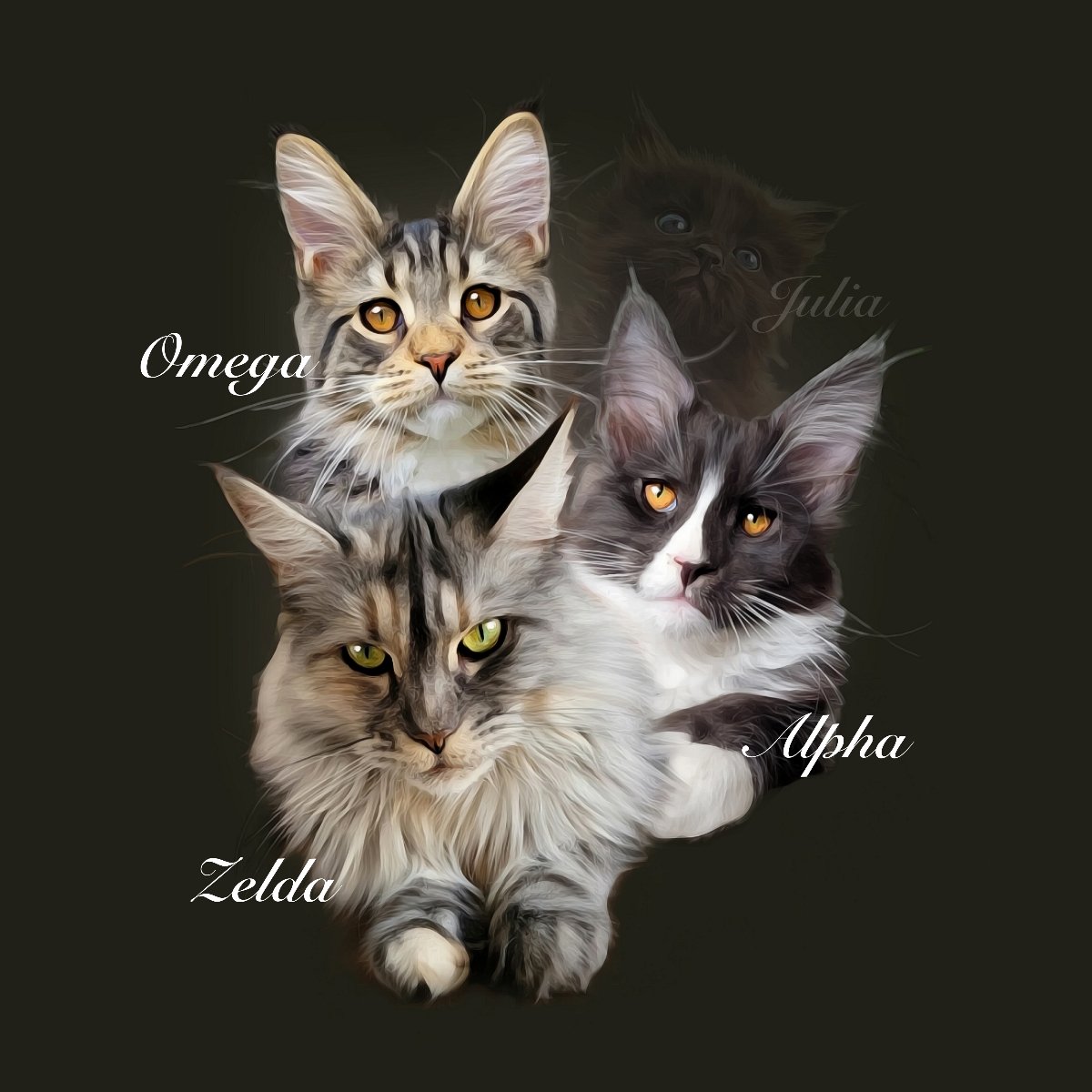 Familie MeowCoonies met rechtsboven overleden zusje Julia