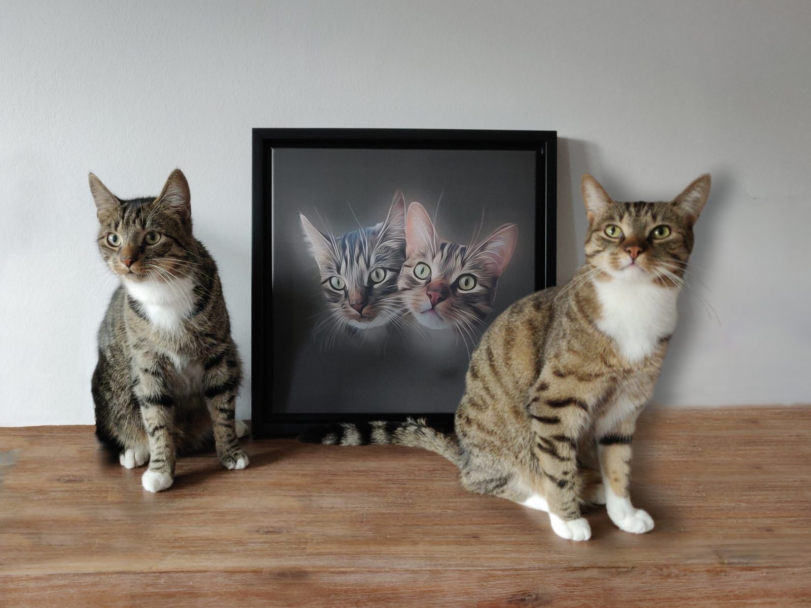 Vorige afbeelding Volgende afbeelding Mufasa en Bailey met hun portret Op canvas 40×40 cm met zwarte lijst